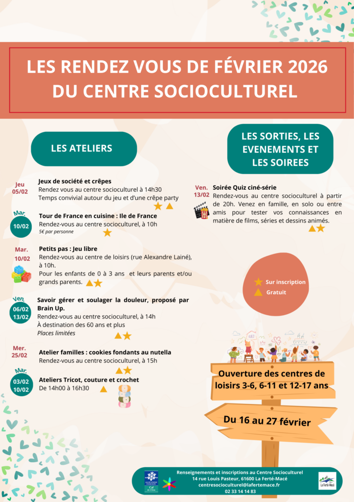 « Tous les Évènements Série d'événement : Ateliers tricot, couture et crochet Ateliers tricot, couture et crochet 3 février - 14 h 00 à 16 h 30 « Soirée jeux Saison culturelle, Mentir Io Minimo » Au centre socioculturel Thérèse Letinturier , de 14h à 16h30. Ajouter au calendrier Google Agenda iCalendar Outlook 365 Outlook Live Détails Date : 3 février Heure : 14 h 00 à 16 h 30 Série : Ateliers tricot, couture et crochet Catégories d’Évènement: Atelier, Loisirs, Santé - Social Évènement Tags:Agenda Organisateur Centre Socioculturel Thérèse Letinturier Téléphone 02 33 14 14 83 E-mail centresocioculturel@lafertemace.fr Lieu Centre Socioculturel Thérèse Letinturier 14 Rue Pasteur La Ferté-Macé, 61600 + Google Map Évènements liés Saison culturelle, Mentir Io Minimo 3 février - 20 h 30 Crêpe party 5 février - 14 h 30 Ciné débat : Fraude bancaire 5 février - 19 h 30
