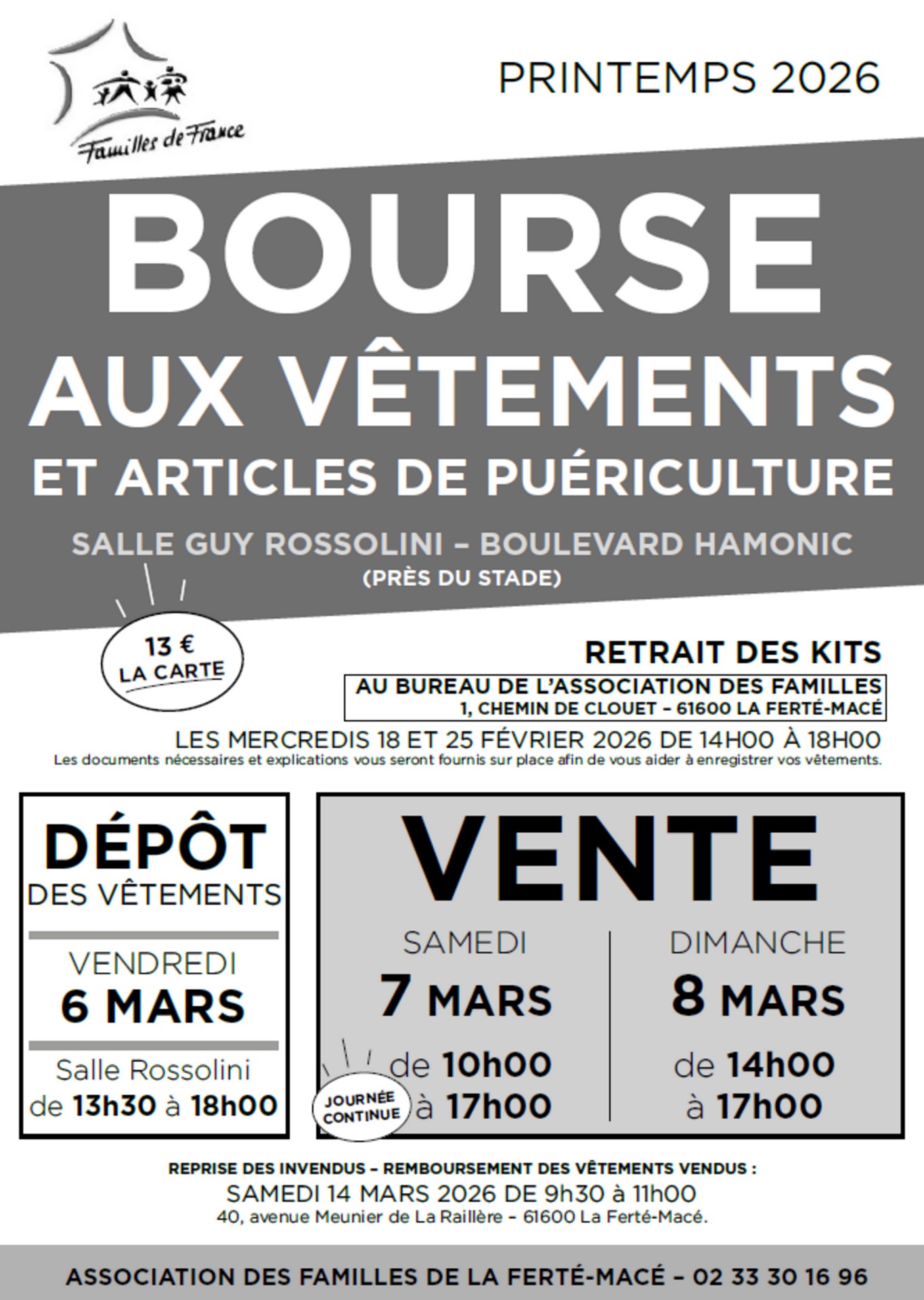 « Tous les Évènements Série d'événement : Bourse aux vêtements (Printemps) Bourse aux vêtements (Printemps) 7 mars « Bourse aux vêtements (Printemps) Foire aux livres » Les 7 et 8 mars, salle Guy Rossolini. Dépôt des articles le 6 mars Ajouter au calendrier Google Agenda iCalendar Outlook 365 Outlook Live Détails Date : 7 mars Série : Bourse aux vêtements (Printemps) Catégories d’Évènement: Expositions, Loisirs, Marché - Braderie, Santé - Social Évènement Tags:Agenda Organisateur Association des Familles Téléphone 02 33 30 16 96 Lieu Salle Guy Rossolini Bd Hamonic La Ferté-Macé, 61600 + Google Map Évènements liés Ateliers tricot, couture et crochet 3 février - 14 h 00 à 16 h 30 Saison culturelle, Mentir Io Minimo 3 février - 20 h 30 Crêpe party 5 février - 14 h 30