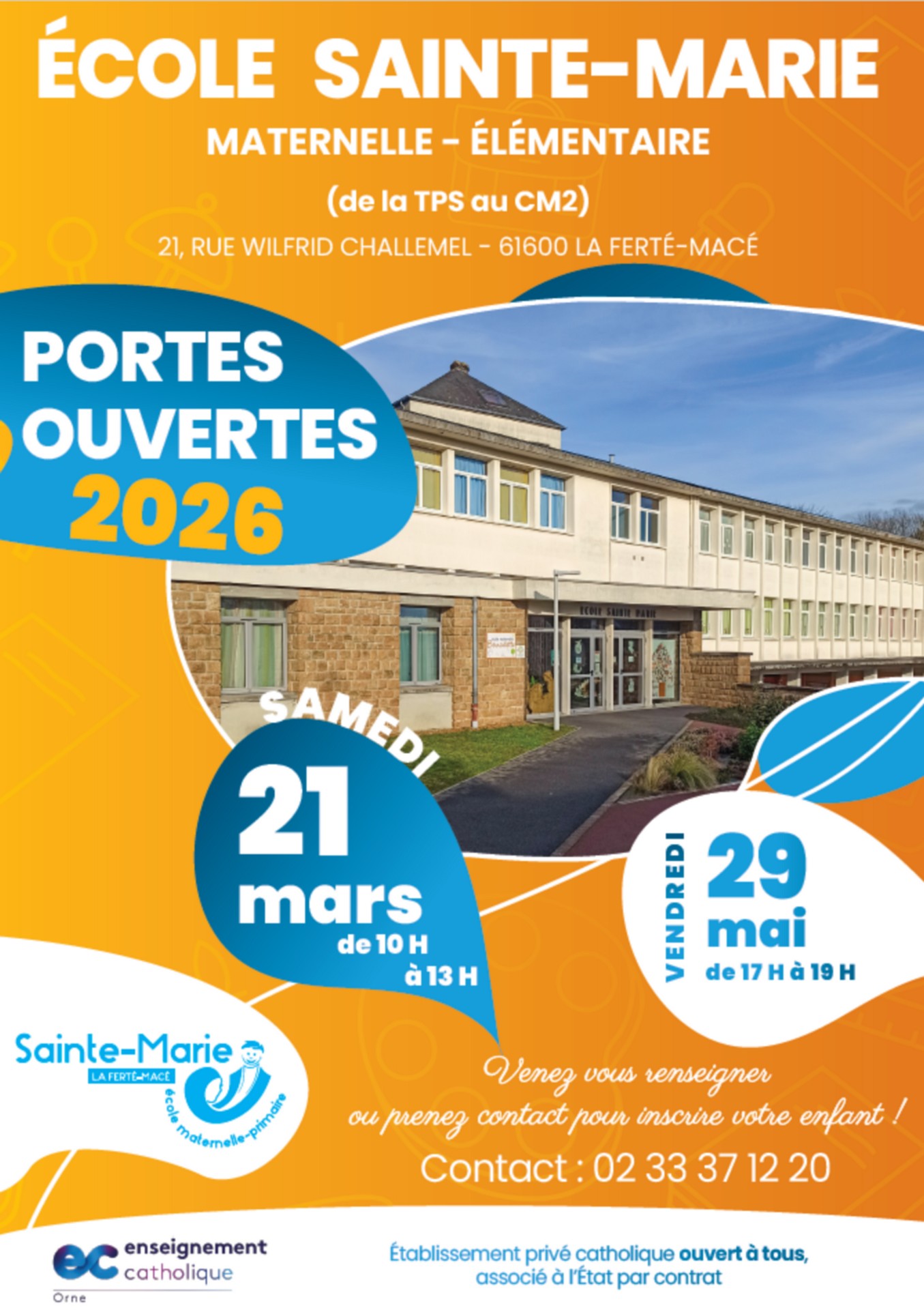 « Tous les Évènements Série d'événement : Portes ouvertes Ecole Ste Marie Portes ouvertes Ecole Ste Marie 21 mars - 10 h 00 à 13 h 00 « Soirée jeux Clic express » Portes ouvertes les 21 mars et 29 mai 2026 Ajouter au calendrier Google Agenda iCalendar Outlook 365 Outlook Live Détails Date : 21 mars Heure : 10 h 00 à 13 h 00 Série : Portes ouvertes Ecole Ste Marie Catégorie d’Évènement: Santé - Social Évènement Tags:Agenda Lieu Ecole Ste Marie 21 Rue W. Challemel La Ferté-Macé, 61600 + Google Map Téléphone 02 33 37 19 53 / 02 33 37 12 20 Voir Lieu site web Évènements liés Ciné débat : Fraude bancaire 5 février - 19 h 30 Atelier seniors 6 février - 14 h 00 AG Les amis des jeux 6 février - 18 h 30