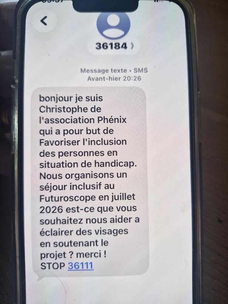 Attention : SMS frauduleux de la part de Christophe de l’association PHENIX. Ne pas répondre. En cas de doute, contactez le 02 33 38 05 75 Voici une capture d’écran :