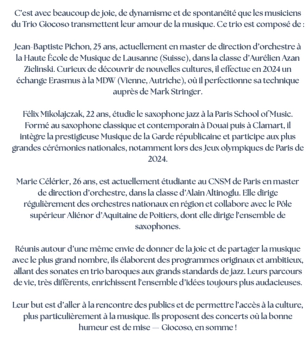 L’association pour la Restauration de l’Eglise Notre-Dame organise un concert avec le « Trio Giocoso » le dimanche 3 mai 2026 à 15h, en l’Eglise Notre-Dame de La Ferté-Macé.