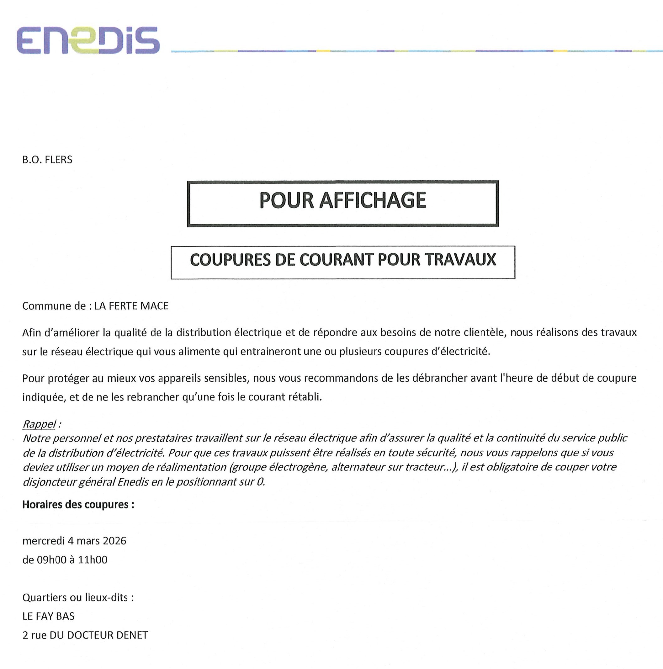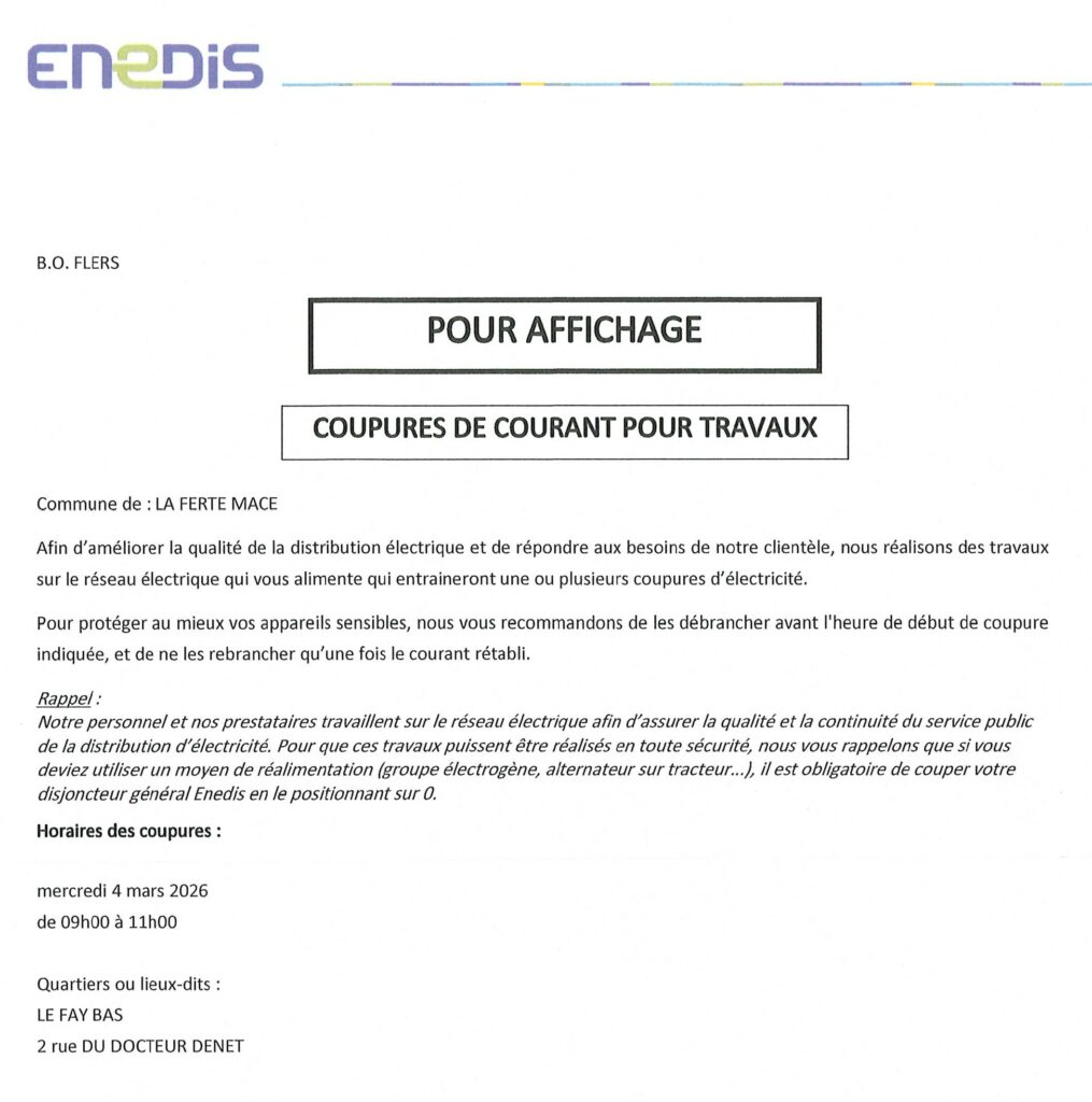Une coupure de courant est prévue le 04 mars 2026 de 9h à 11h – Le Fay Bas, 2 rue du Dr Denet.
