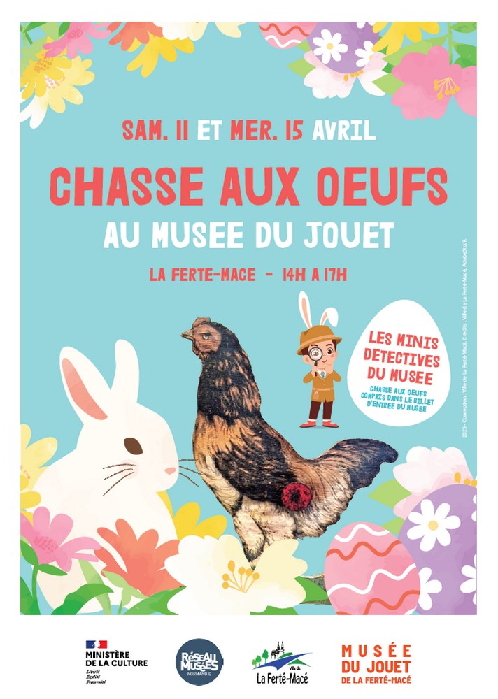 « Tous les Évènements Série d'événement : Chasse aux oeufs Chasse aux oeufs 11 avril - 14 h 00 à 17 h 00 « Enduro carpe Les Andain’ries « Les virils » » Chasse aux oeufs au Musée du Jouet les 11 et 15 avril de 14h à 17h. Ajouter au calendrier Google Agenda iCalendar Outlook 365 Outlook Live Détails Date : 11 avril Heure : 14 h 00 à 17 h 00 Série : Chasse aux oeufs Catégories d’Évènement: Loisirs, Sports et Loisirs Évènement Tags:Agenda Organisateur Service Culture, Sports et Loisirs Téléphone 02 33 37 38 10 E-mail sports.loisirs@lafertemace.fr Lieu Musée du Jouet Rue de la Victoire La Ferté-Macé, 61600 + Google Map Évènements liés Clic express 19 mars - 15 h 00 Ciné – Semaine du handicap 19 mars - 20 h 30 Carnaval 20 mars - 14 h 00 à 16 h 30