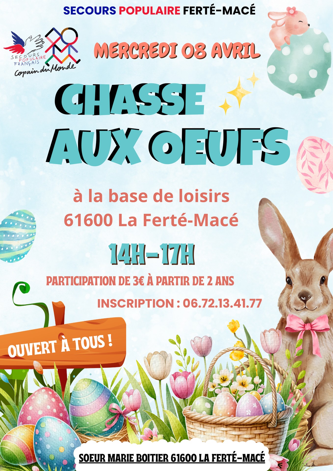« Tous les Évènements Série d'événement : Chasse aux oeufs Chasse aux oeufs 8 avril - 14 h 00 à 17 h 00 « Soirée jeux Clic express » Chasse aux oeufs organisée par le Secours Populaire. A la Base de Loisirs Ajouter au calendrier Google Agenda iCalendar Outlook 365 Outlook Live Détails Date : 8 avril Heure : 14 h 00 à 17 h 00 Série : Chasse aux oeufs Catégories d’Évènement: Loisirs, Plein air, Santé - Social, Sports et Loisirs Évènement Tags:Agenda Organisateur Secours Populaire de La Ferté-Macé Téléphone 02 33 67 44 90 / 06 75 40 61 99 E-mail animation@spf61.org Lieu Base de Loisirs Bd de la Forêt d'Andaine La Ferté-Macé, 61600 + Google Map Évènements liés Clic express 19 mars - 15 h 00 Ciné – Semaine du handicap 19 mars - 20 h 30 Carnaval 20 mars - 14 h 00 à 16 h 30