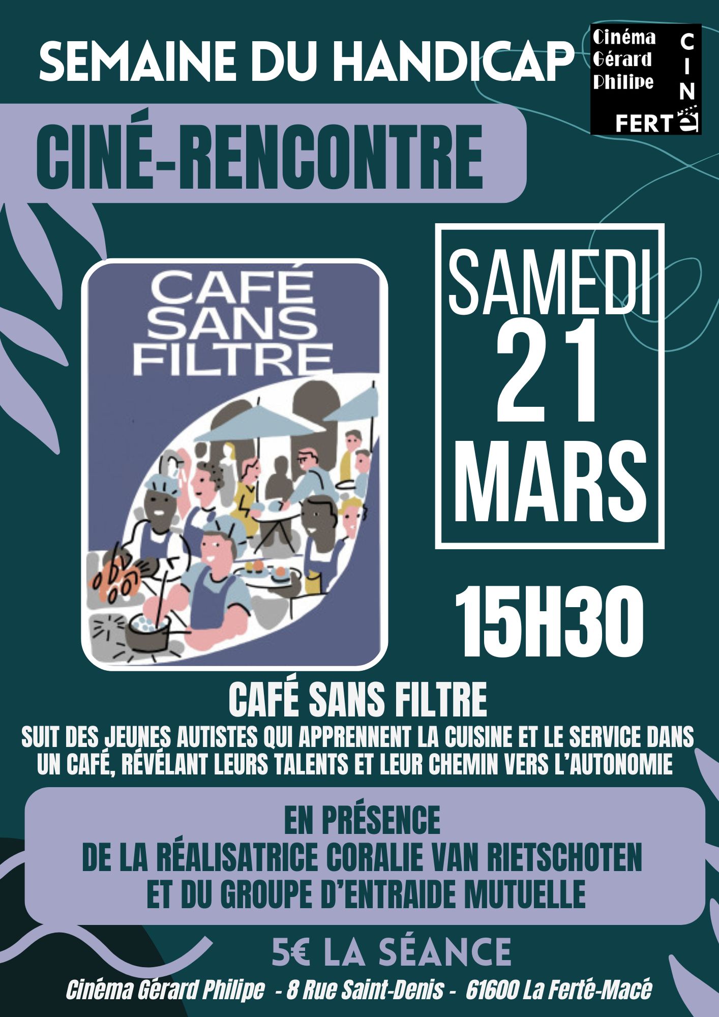 « Tous les Évènements Série d'événement : Ciné – Semaine du handicap Ciné – Semaine du handicap 21 mars - 15 h 30 « Portes ouvertes Ecole Ste Marie Ciné – Semaine du handicap » Ciné rencontre Ajouter au calendrier Google Agenda iCalendar Outlook 365 Outlook Live Détails Date : 21 mars Heure : 15 h 30 Série : Ciné – Semaine du handicap Catégories d’Évènement: Cinéma, Concert - Spectacle - Débat, Loisirs, Sports et Loisirs Évènement Tags:Agenda Organisateur CinéFerté Téléphone 02 33 38 29 02 E-mail cinemagerardphilipe@wanadoo.fr Voir le site Organisateur Lieu Cinéma Salle G. Philipe 8 rue St Denis La Ferté-Macé, + Google Map Évènements liés Clic express 12 mars - 15 h 00 Ciné rencontre 12 mars - 20 h 30 Ciné rencontre 13 mars - 9 h 00
