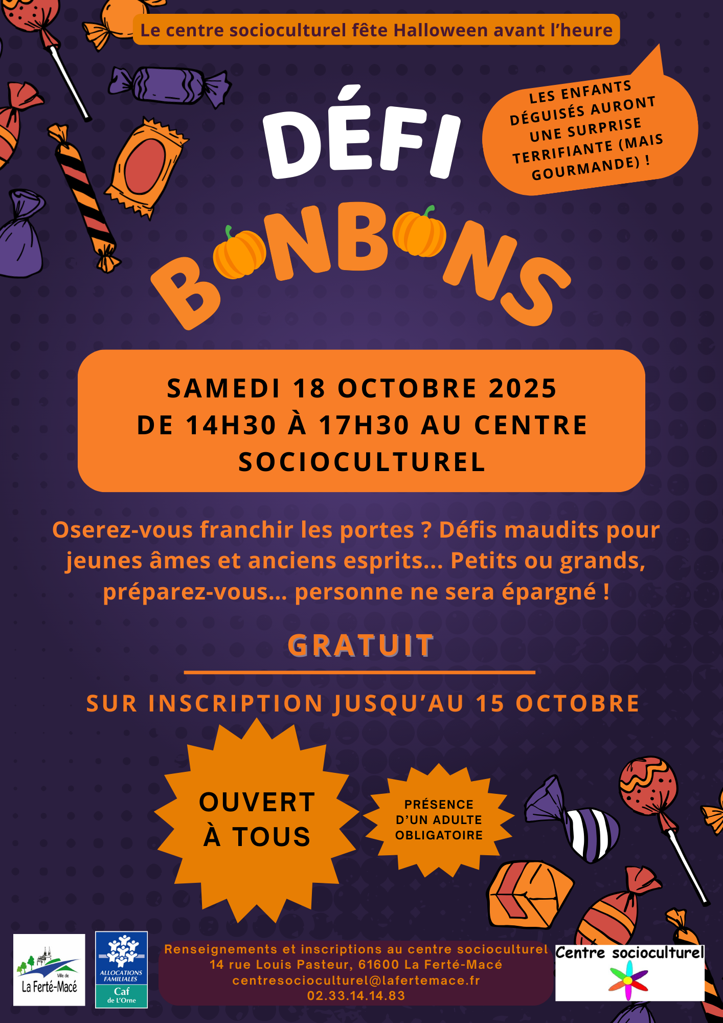 « Tous les Évènements Cet évènement est passé. Défi bonbon 18 octobre - 14 h 30 à 17 h 30|Évènement récurrent (Voir toutes les dates)Un événement le 18 octobre 2025 à 14 h 30 « Journées mycologiques Cyclo cross » Halloween avant l’heure! Ajouter au calendrier Google Agenda iCalendar Outlook 365 Outlook Live Détails Date : 18 octobre Heure : 14 h 30 à 17 h 30 Catégories d’Évènement: Loisirs, Santé - Social, Sports et Loisirs Évènement Tags:Agenda Organisateur Centre Socioculturel Thérèse Letinturier Téléphone 02 33 14 14 83 E-mail centresocioculturel@lafertemace.fr Lieu Centre Socioculturel Thérèse Letinturier 14 Rue Pasteur La Ferté-Macé, 61600 + Google Map Évènements liés Soirée choucroute 15 novembre|Évènement récurrent (Voir toutes les dates)Un événement le 15 novembre 2025 à 0 h 00 Bourse aux jouets 15 novembre - 13 h 30 à 18 h 00 Petits pas (0-3 ans) 18 novembre|Évènement récurrent (Voir toutes les dates)Un événement le 14 octobre 2025 à 0 h 00Un événement le 18 novembre 2025 à 0 h 00Un événement le 16 décembre 2025 à 0 h 00