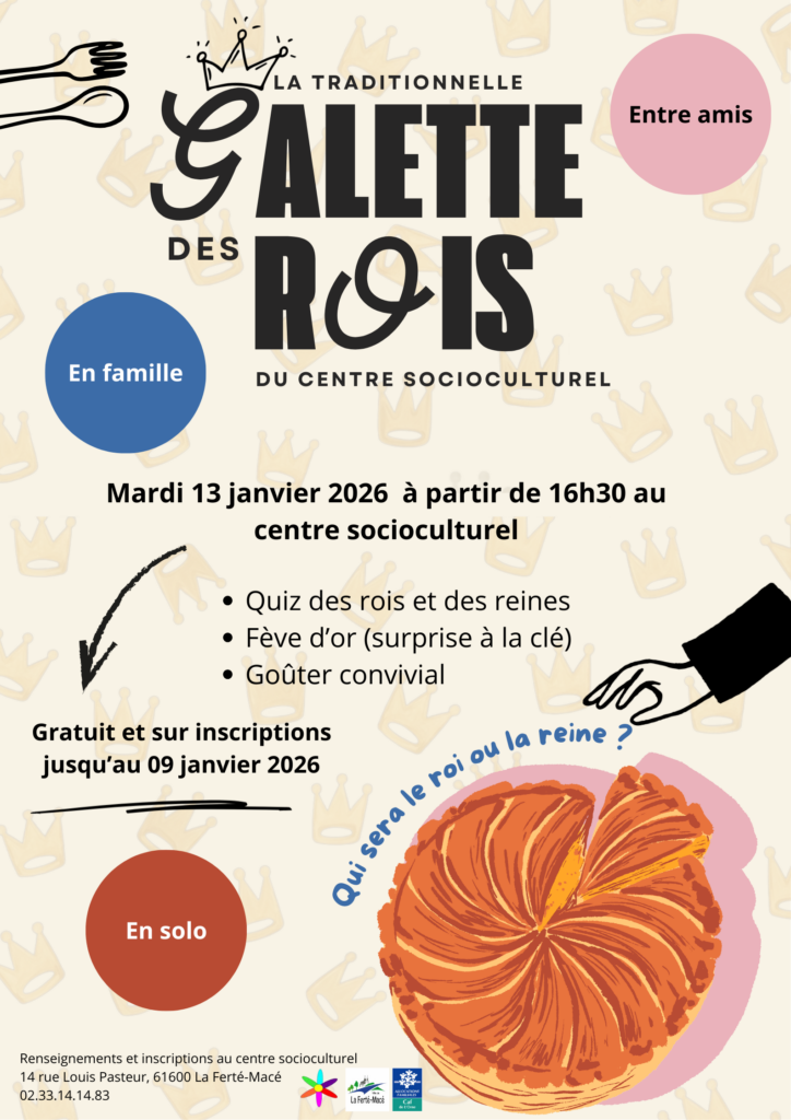 « Tous les Évènements Série d'événement : Galette des Rois Galette des Rois 13 janvier 2026 - 16 h 30 « Tour de France en cuisine Soirée jeux » Galette des rois au Centre Socioculturel Thérèse Letinturier. Gratuit sur inscription Ajouter au calendrier Google Agenda iCalendar Outlook 365 Outlook Live Détails Date : 13 janvier 2026 Heure : 16 h 30 Série : Galette des Rois Catégories d’Évènement: Loisirs, Repas, Santé - Social, Sports et Loisirs Évènement Tags:Agenda Organisateur Centre Socioculturel Thérèse Letinturier Téléphone 02 33 14 14 83 E-mail centresocioculturel@lafertemace.fr Lieu Centre Socioculturel Thérèse Letinturier 14 Rue Pasteur La Ferté-Macé, 61600 + Google Map Évènements liés Soirée jeux 19 décembre - 20 h 00 à 22 h 00 Musée du jouet (décembre) 20 décembre UCIA – Opération de Noël 20 décembre