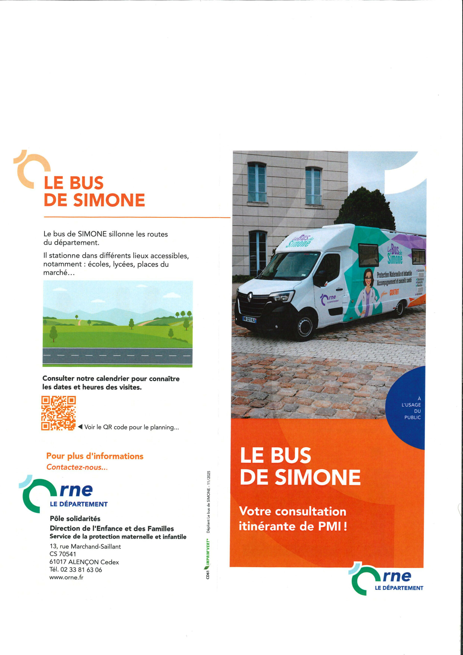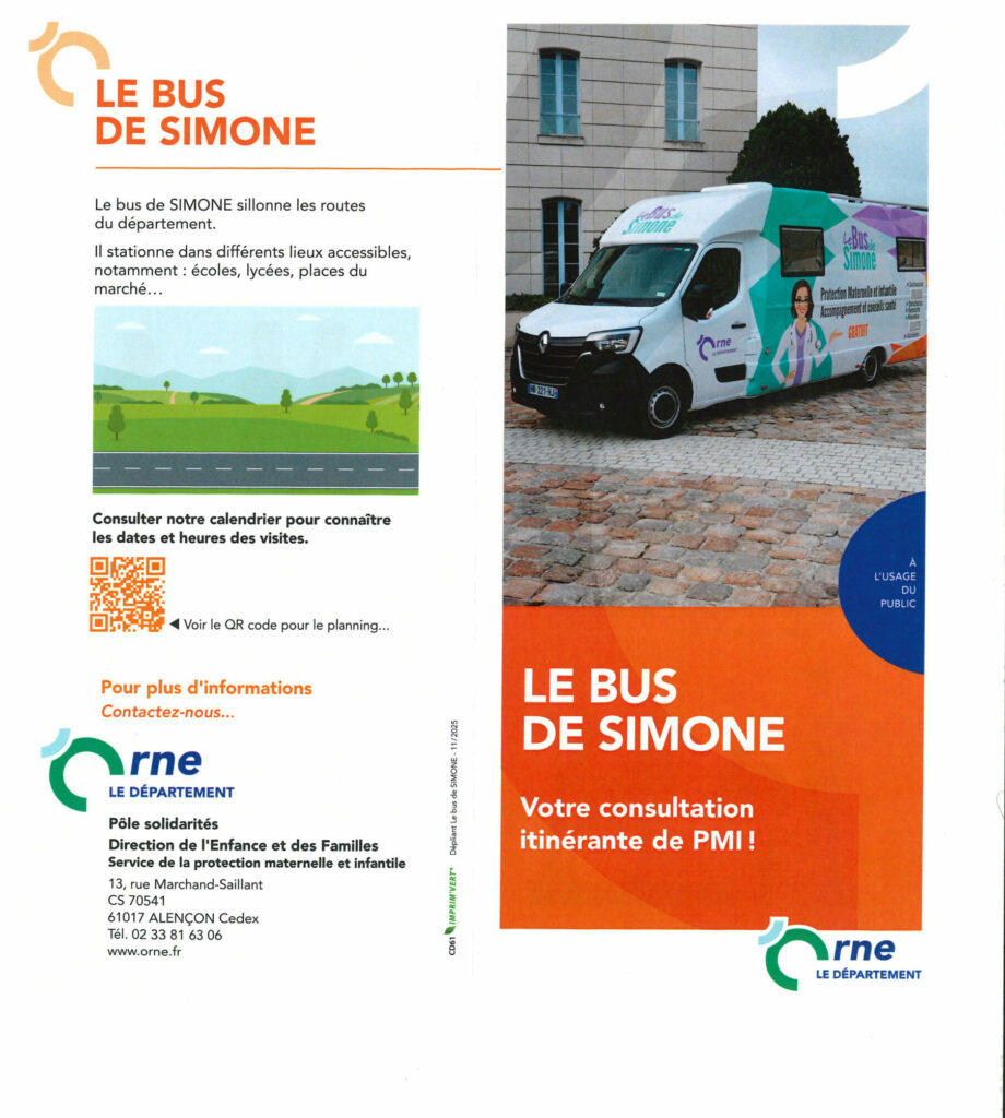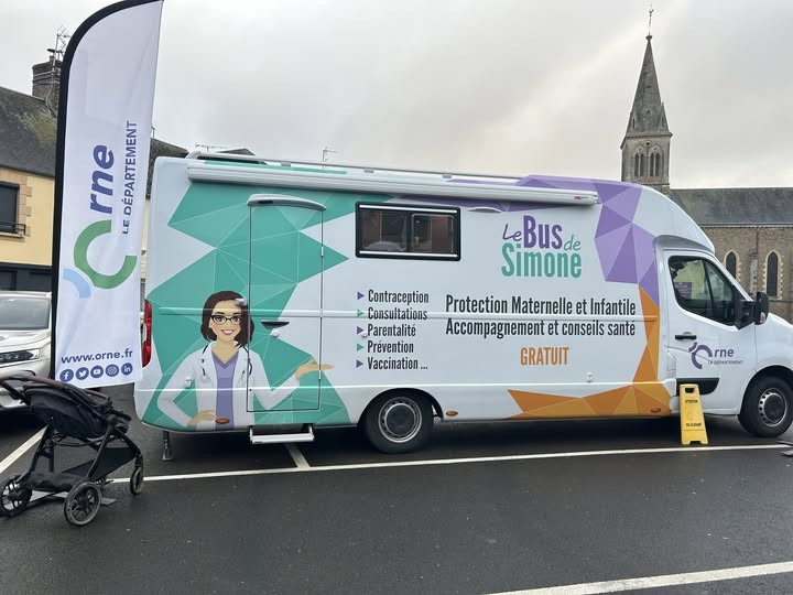 Le Bus de Simone, votre consultation itinérante de PMI présent à La Ferté-Macé les 9 avril, 7 et 21 mai, 4 et 18 juin et 2 juillet 2026.