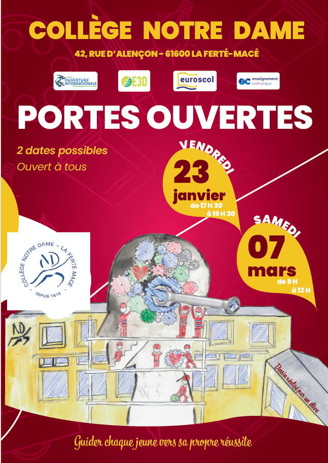« Tous les Évènements Série d'événement : Portes Ouvertes Collège Notre Dame Portes Ouvertes Collège Notre Dame 7 mars 2026 « Bourse aux vêtements Soirée jeux » Portes ouvertes Collège Notre-Dame : 23 janvier :17h30-19h30 07 mars : 9h-12h Ajouter au calendrier Google Agenda iCalendar Outlook 365 Outlook Live Détails Date : 7 mars 2026 Série : Portes Ouvertes Collège Notre Dame Catégorie d’Évènement: Santé - Social Évènement Tags:Agenda Lieu collège Notre Dame 42 Rue d'Alençon La Ferté-Macé, 61600 + Google Map Téléphone 02 33 14 03 10 Voir Lieu site web Évènements liés Soirée jeux 19 décembre - 20 h 00 à 22 h 00 Musée du jouet (décembre) 20 décembre UCIA – Opération de Noël 20 décembre