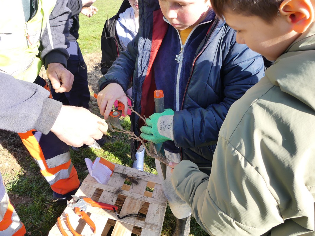 Dans le cadre de la class’climat du Parc Naturel Régional Normandie Maine et de l’Aire Terrestre Educative (ATE) financée par l’Office Française de la Biodiversité, le CPIE Collines normandes a accompagné l’école élémentaire Paul Souvray pour la plantation d’une haie bocagère sur le site du SwinGolf à La Ferté-Macé, le vendredi 7 mars 2025; en présence des agents du service espaces verts de la ville, des bénévoles de l’Association SwinGolf, de Yves Sallard conseiller municipal délégué à l’aménagement durable et sur les conseils de Béatrice Gillot chargée de mission au CPIE.