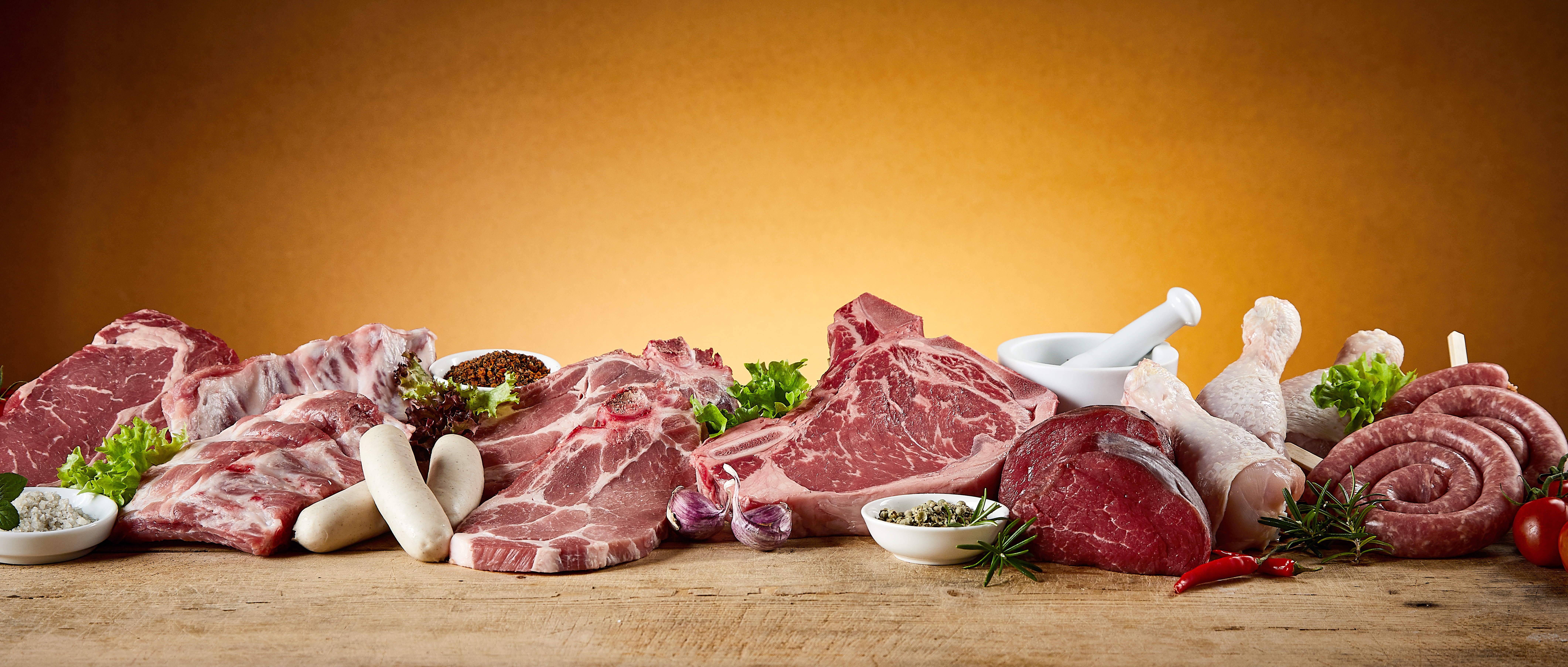 Panorama banner with large assortment of raw meat for a BBQ with beef steak, kringelwurst, sausages, pork and chicken legs suitable for butchery advertising