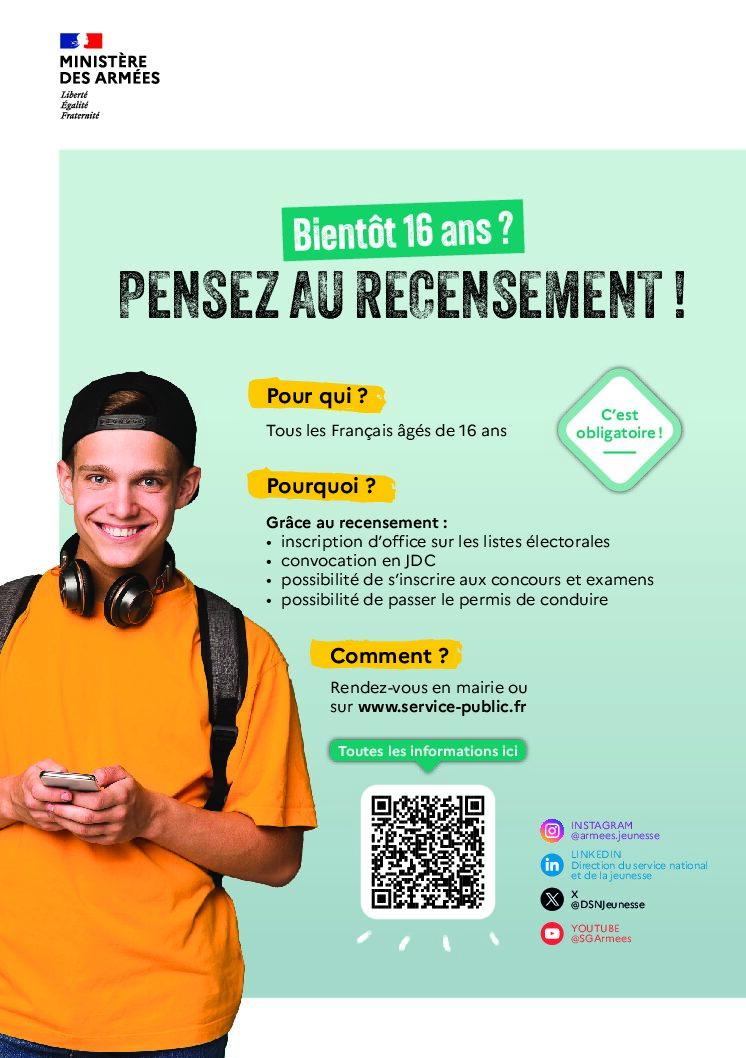 Le recensement citoyen est obligatoire pour les jeunes Français, filles et garçons, dès l’âge de 16 ans.